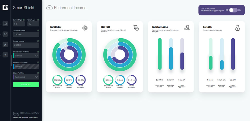 The SmartShield Simulator draws on decades of our actuarial experience to run stochastic projections and simulate thousands of potential future trajectories across a selection of available client portfolios. The Simulator looks at the client’s current asset allocation and compares this across each of Milliman’s SmartShield Series of risk protected managed accounts (Figure 1).