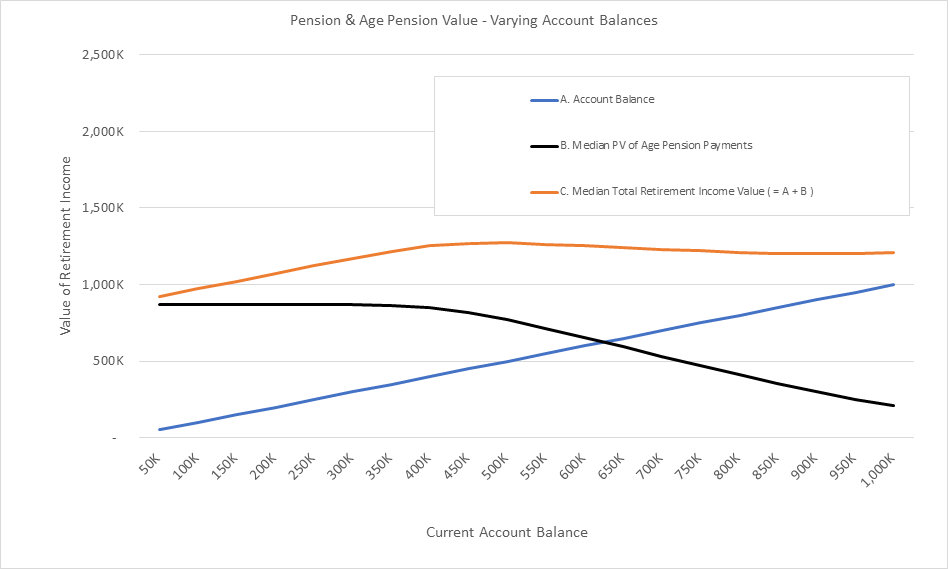In fact, the median value of their Age Pension more than doubles, rising to approximately $500,000, essentially offsetting the entire fall in their retirement savings.
